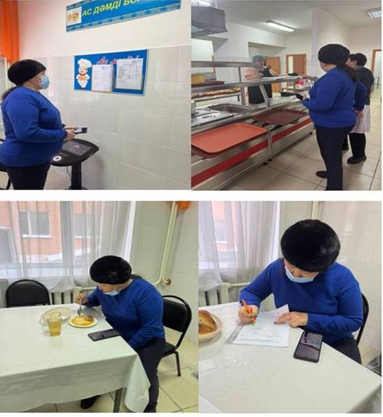Тағам ас мәзіріне сәйкес, әрі нормаға сай. Қайнаған су өз уақтысымен ауыстырылып отырады. Келген азық-түліктің сапасы мерзіміне қарап қабылданады. Тағам ас мәзіріне сәйкес, әрі нормаға сай. Жалпы асханада санитарлық талаптар сақталған таза, қызметкерлерлердің сыртқы киім үлгісі кейбір жұмысшыларына ескерту айтылды, барлық санитарлық талапқа сай. Асхана жұмысы уақытымен және оқушылар кесте бойынша тамақтанады. 1 сабақтан кейін 1-4 сыныптар, сабақтан кейін 5-8 сыныптар, ал үшінші сабақтан кейін 9-11 сыныптар тамақтанды.